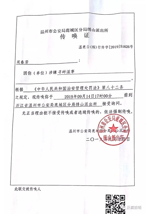 荒唐的传唤证:温州市公安局鹿城区分局绣山派出所传唤证(被传唤人周春芳),温鹿公(绣)行传字[2019]51626号传唤证显示时间为:9月14日下午17时00分。