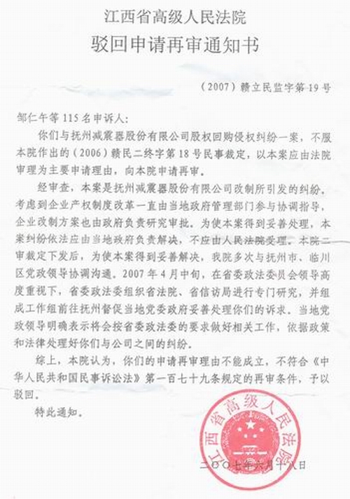 2006年11月22日,江西省高级人民法院再次作出(2006)赣民二终字第18号《民事裁定书》,裁定书称:“本院认为,本案是抚州减震器股份有限公司改制过程中发生的纠纷,该公司产权制度改革一直由政府协调指导,因此本案纠纷应由当地政府负责解决,不应由人民法院受理。本院依照最高人民法院《关于贯彻<中华人民共和国民事诉讼法>若干问题的意见》第一百八十六条的规定,经本院审判委员会决定,裁定撤销原判,驳回起诉。
